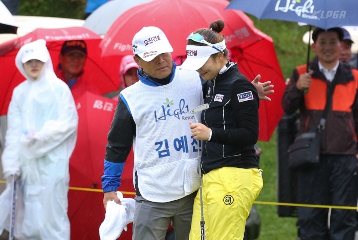 ▲ 우승 확정 후 캐디인 아버지가 김예진의 등을 두들겨 주고 있다.[사진출처=KLPGA]